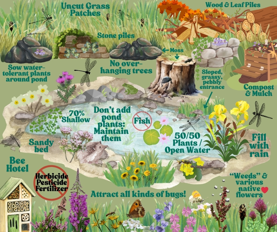 Dragonfly nymphs are opportunistic and they’re the natural apex predator in a small pond, so we’re not vying for anything specific here, just as much habitat as possible for snails, tadpoles, diving beetles, bugs, leeches, isopods, fly larva, etc. Most of this habitat thrives in shallow water so aiming for ~70% shallow water is best.