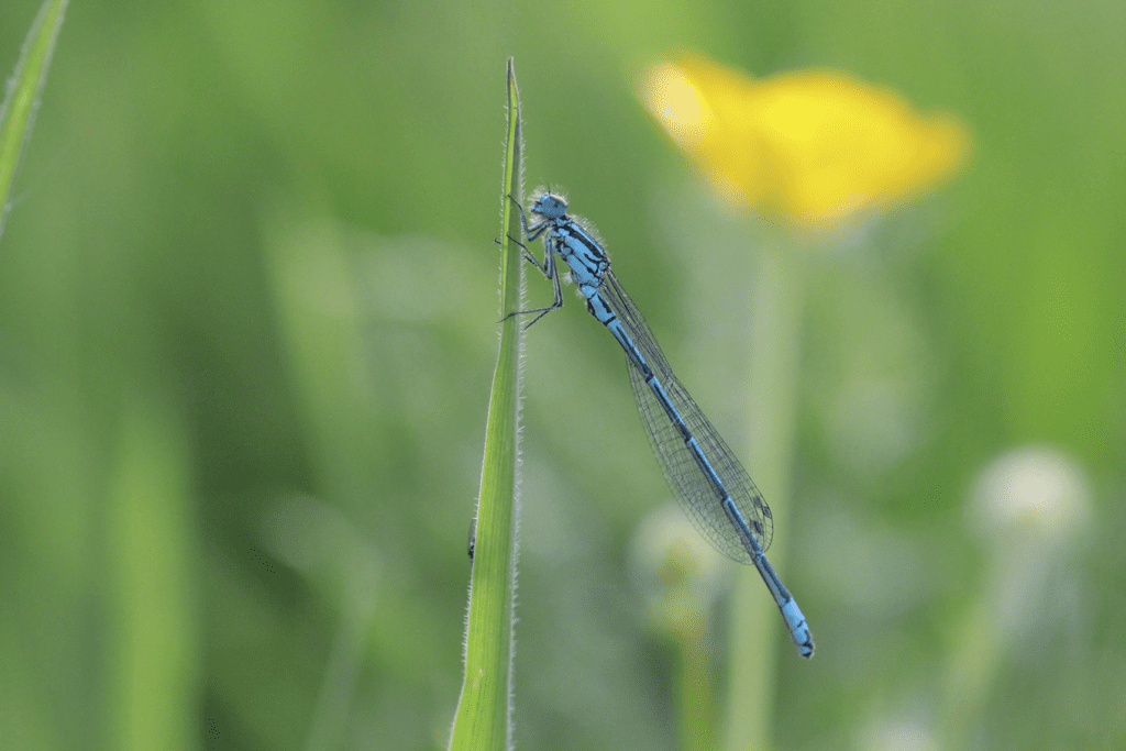 Adult dragonflies are extremely active predators that will pursue all sorts of flying insects. Damselflies are also predators but tend to wait for prey to pass by before pursing. The best way to provide insect prey for Odonates, is to plant a bunch of native wildflowers species around the pond, have a bee hotel, and leave lots of loose piles of decaying wood, leaves, and compost. Additionally, leave uncut grassy areas, encourage weeds and moss, and always avoid any kind of chemical pesticide/herbicide. Also avoid fertilizers that could be rained into your pond. If you must use fertilizers, then keep to the organic kind and do so away from your pond. Nearby trees and/or native hedges including, hawthorn, blackthorn, bramble, hazel, ash, and/or oak, are also important to provide areas for odonates to safely rest. Adult odonates also like to perch and sun themselves, so adding piles of rocks, wooden posts, log piles, and standing dead branches will be perfect for this.