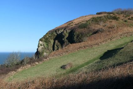 2) Clear and tidy up the entrance to Hillsborough at the top of the Pitch and Putt field including the Coast path steps. Repair the collapsed stone wall in the entrance area. Remove overhanging branches and scrub from some of the paths.
